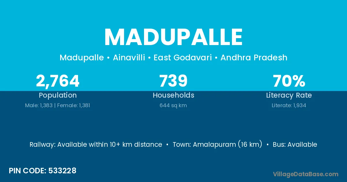 The literacy rate of Madupalle village is 57.74%. Male literacy stands at 66.30% and female literacy at 49.36%.