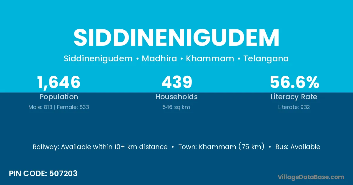 Khammam (75 km) is the nearest town to Siddinenigudem village for major economic activities and is located approximately 75 km away.