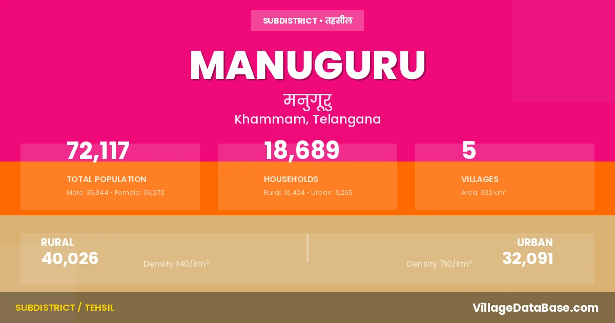 According to the 2011 census The total area of Manuguru Mandal is 332 km², with a population of 72117 people. The population density is 217 inhabitants per square kilometre, and there are approximately 18689 houses in the sub district.
