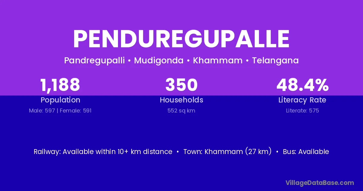 Khammam (27 km) is the nearest town to Penduregupalle village for major economic activities and is located approximately 27 km away.