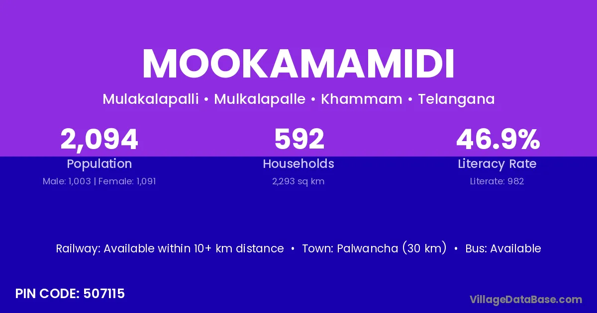 Palwancha (30 km) is the nearest town to Mookamamidi village for major economic activities and is located approximately 30 km away.