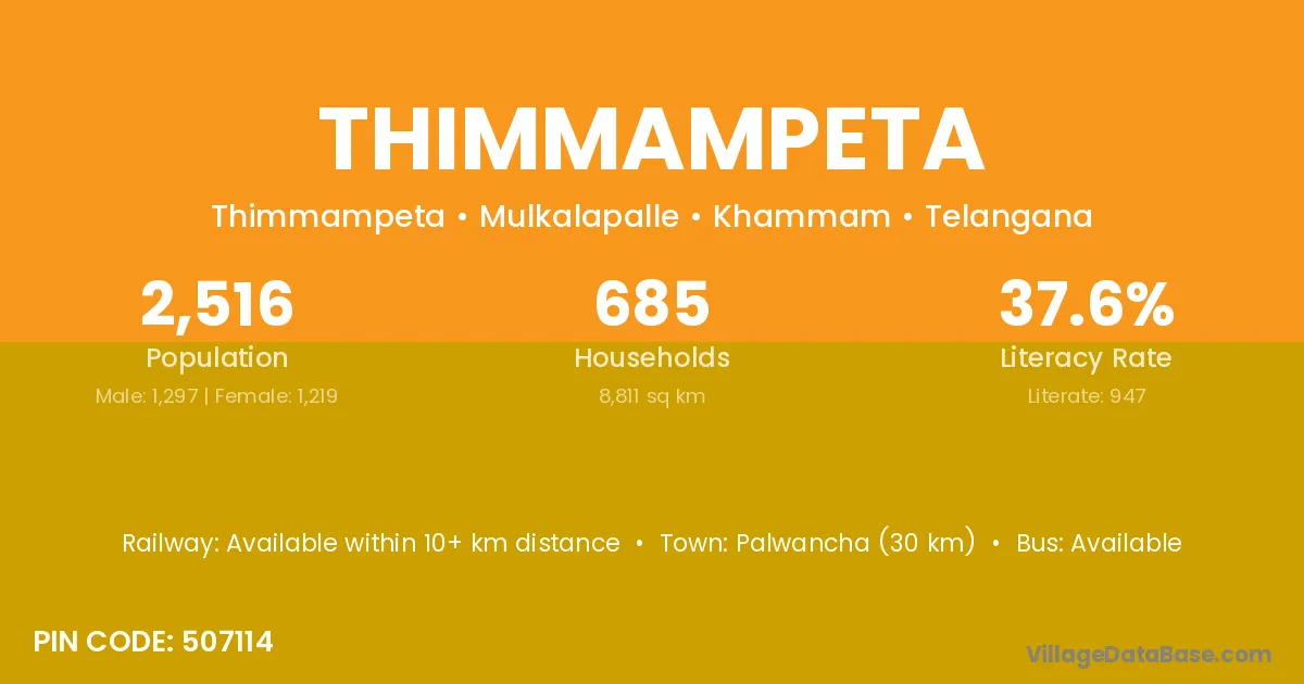 Palwancha (30 km) is the nearest town to Thimmampeta village for major economic activities and is located approximately 30 km away.