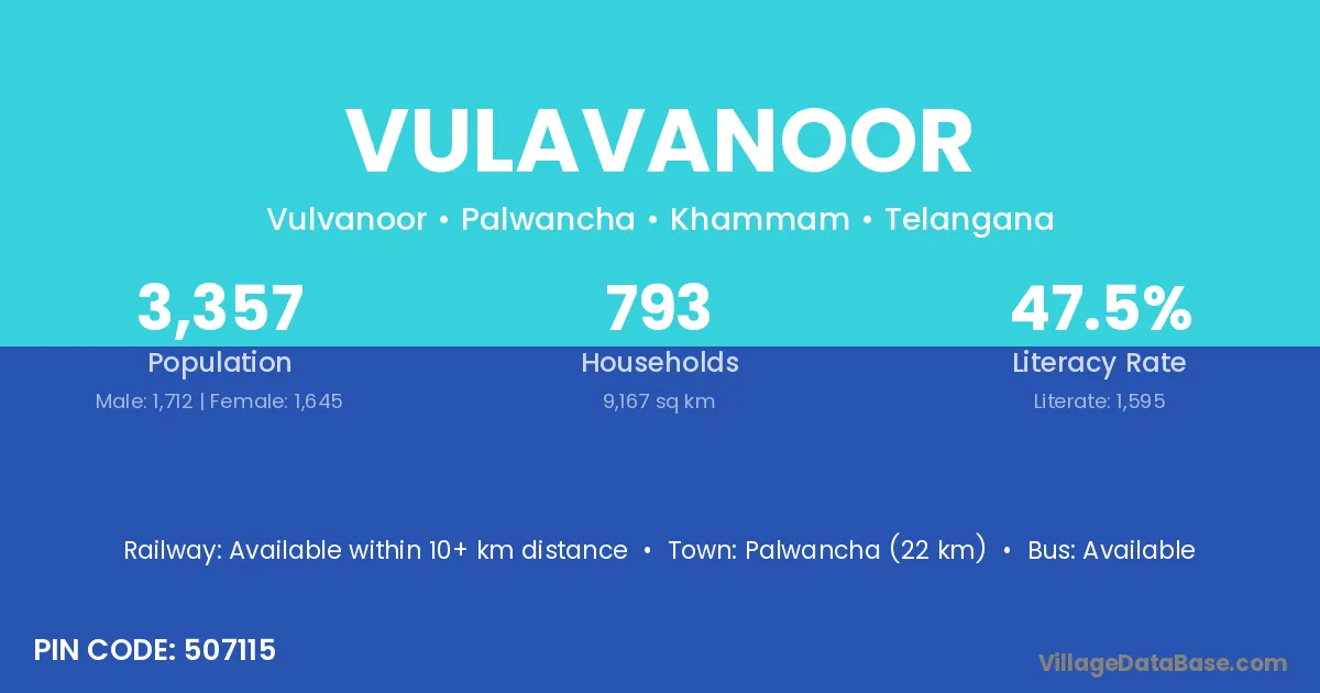 Palwancha (22 km) is the nearest town to Vulavanoor village for major economic activities and is located approximately 22 km away.