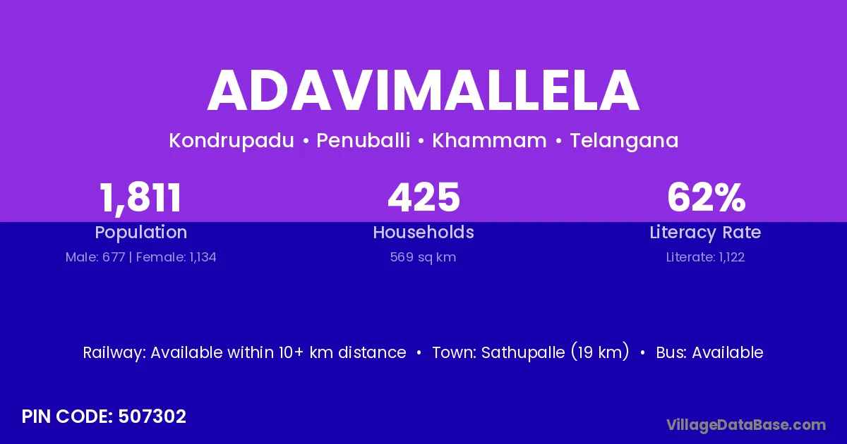 Sathupalle (19 km) is the nearest town to Adavimallela village for major economic activities and is located approximately 19 km away.