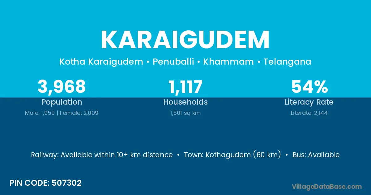 Kothagudem (60 km) is the nearest town to Karaigudem village for major economic activities and is located approximately 60 km away.