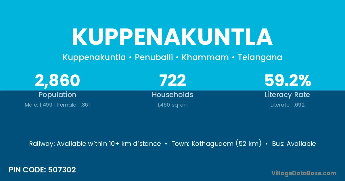 Kothagudem (52 km) is the nearest town to Kuppenakuntla village for major economic activities and is located approximately 52 km away.