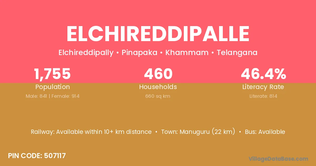 Manuguru (22 km) is the nearest town to Elchireddipalle village for major economic activities and is located approximately 22 km away.