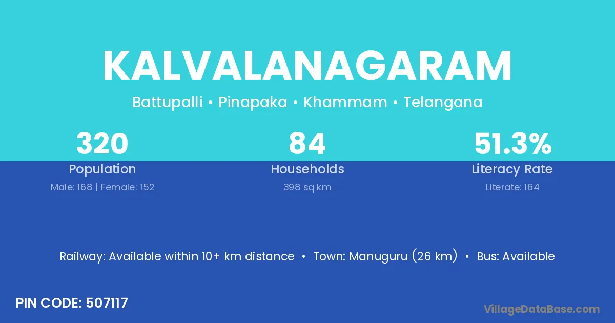 Manuguru (26 km) is the nearest town to Kalvalanagaram village for major economic activities and is located approximately 26 km away.