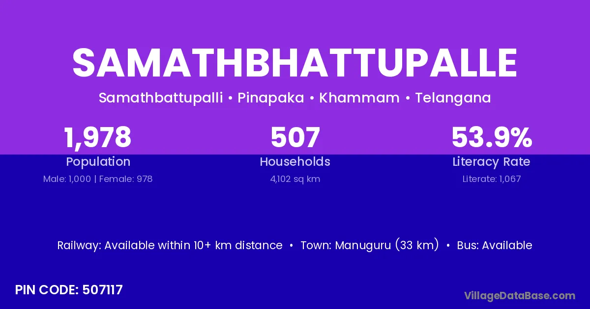 Manuguru (33 km) is the nearest town to Samathbhattupalle village for major economic activities and is located approximately 33 km away.