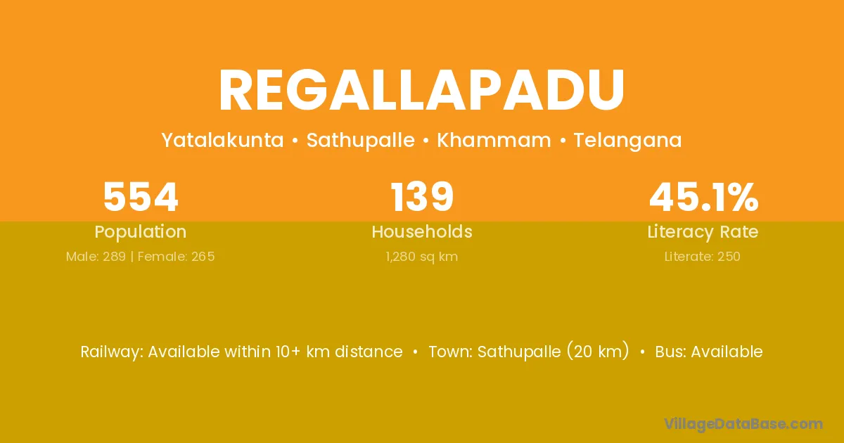 Sathupalle (20 km) is the nearest town to Regallapadu village for major economic activities and is located approximately 20 km away.