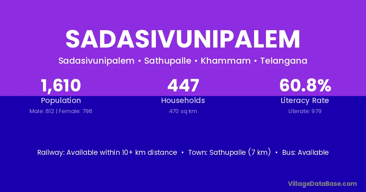 Sathupalle (7 km) is the nearest town to Sadasivunipalem village for major economic activities and is located approximately 7 km away.