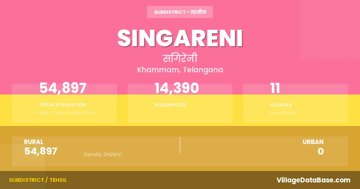 According to the 2011 census The total area of Singareni Mandal is 256 km², with a population of 54897 people. The population density is 214 inhabitants per square kilometre, and there are approximately 14390 houses in the sub district.