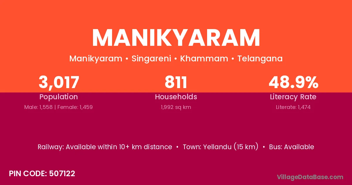 Yellandu (15 km) is the nearest town to Manikyaram village for major economic activities and is located approximately 15 km away.