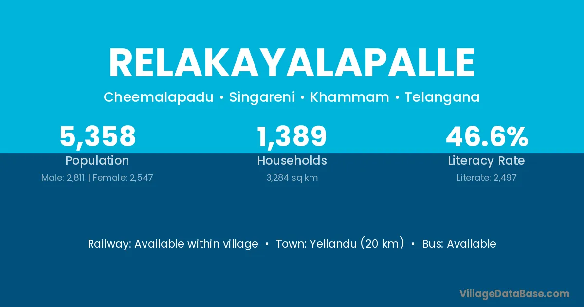 Yellandu (20 km) is the nearest town to Relakayalapalle village for major economic activities and is located approximately 20 km away.