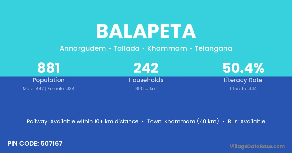 Khammam (40 km) is the nearest town to Balapeta village for major economic activities and is located approximately 40 km away.