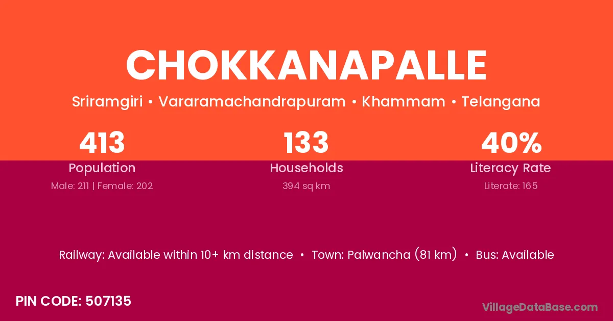 Palwancha (81 km) is the nearest town to Chokkanapalle village for major economic activities and is located approximately 81 km away.