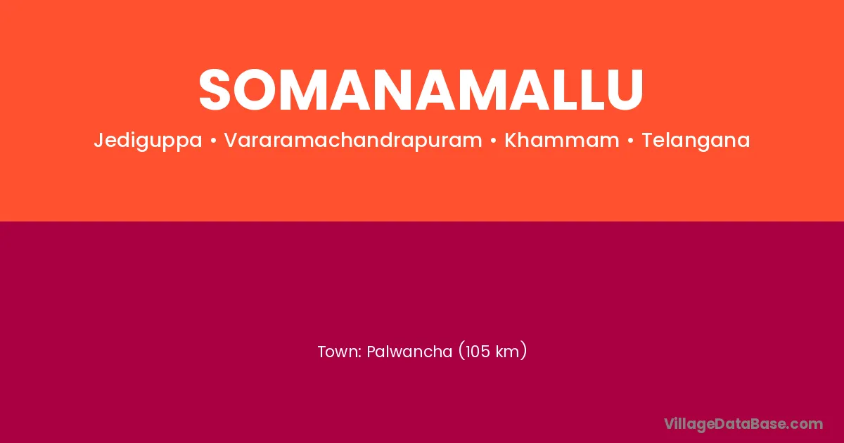 Palwancha (105 km) is the nearest town to Somanamallu village for major economic activities and is located approximately 105 km away.