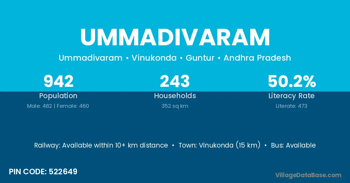 Palwancha (99 km) is the nearest town to Ummadivaram village for major economic activities and is located approximately 99 km away.