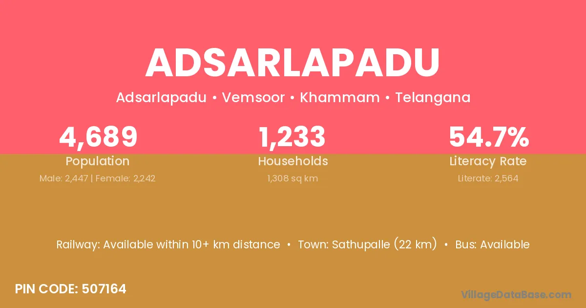 Sathupalle (22 km) is the nearest town to Adsarlapadu village for major economic activities and is located approximately 22 km away.