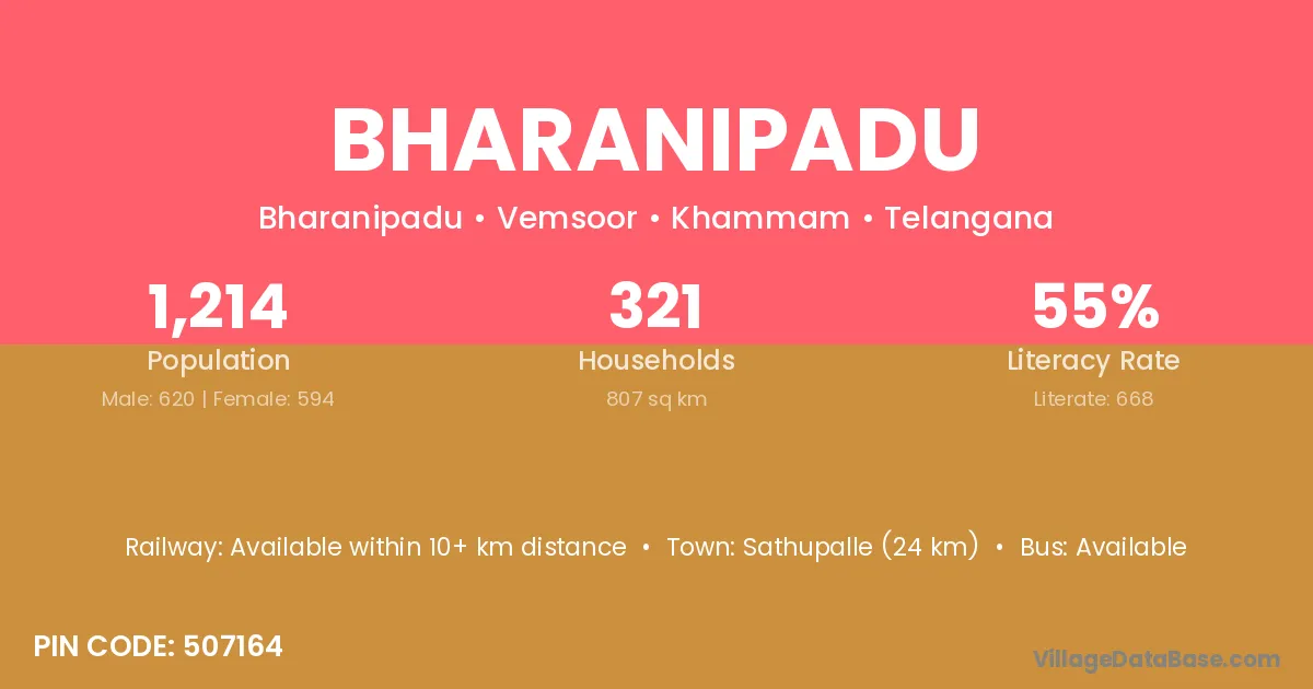 Sathupalle (24 km) is the nearest town to Bharanipadu village for major economic activities and is located approximately 24 km away.