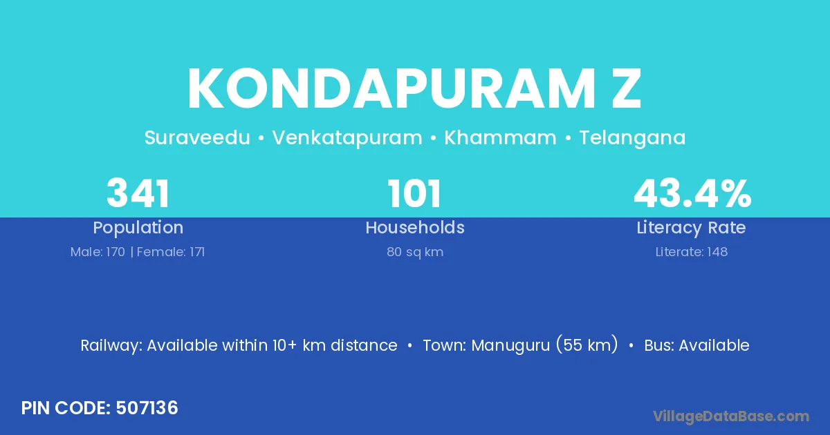 Manuguru (55 km) is the nearest town to Kondapuram Z village for major economic activities and is located approximately 55 km away.