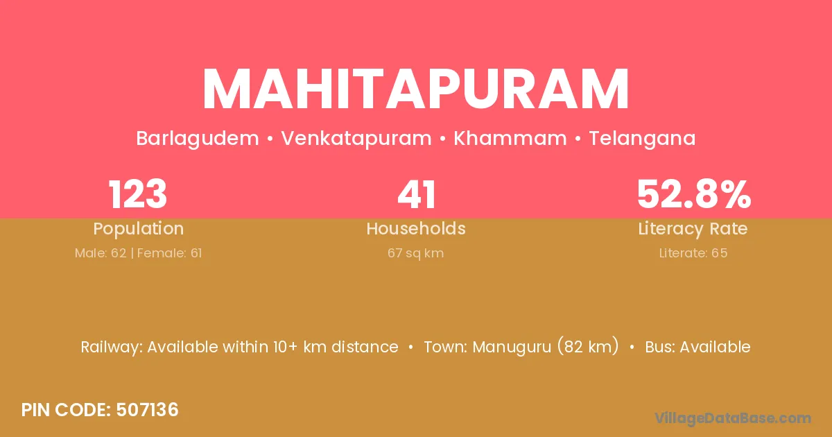 Mahitapuram village has a total population of 123 people, of which 62 are males and 61 are females.