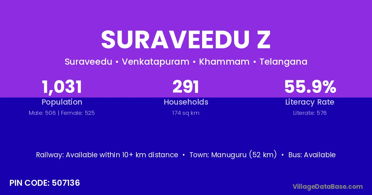 Manuguru (52 km) is the nearest town to Suraveedu Z village for major economic activities and is located approximately 52 km away.