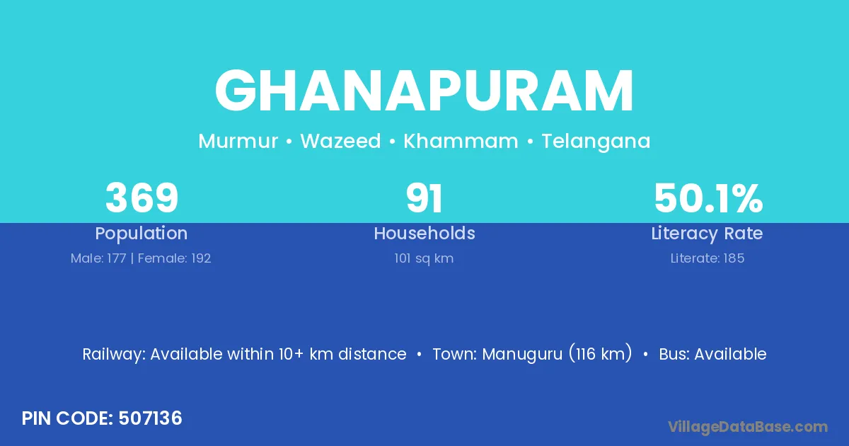 Manuguru (116 km) is the nearest town to Ghanapuram village for major economic activities and is located approximately 116 km away.