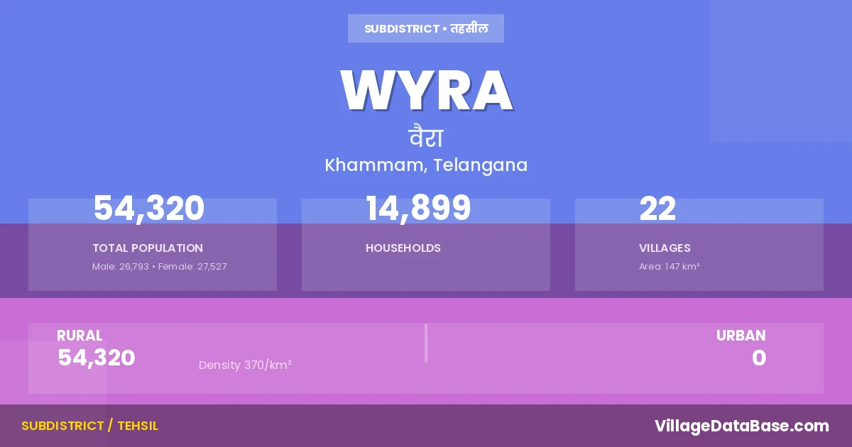 According to the 2011 census The total area of Wyra Mandal is 147 km², with a population of 54320 people. The population density is 370 inhabitants per square kilometre, and there are approximately 14899 houses in the sub district.