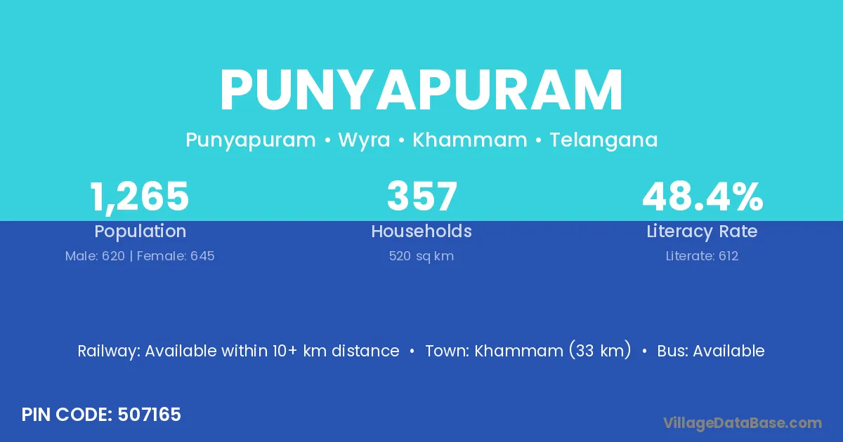 Khammam (33 km) is the nearest town to Punyapuram village for major economic activities and is located approximately 33 km away.
