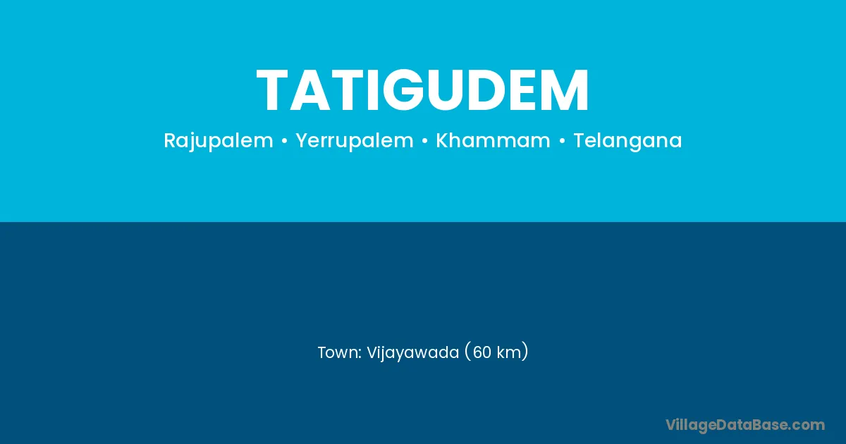 Vijayawada (60 km) is the nearest town to Tatigudem village for major economic activities and is located approximately 60 km away.