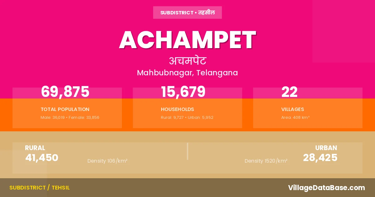 According to the 2011 census The total area of Achampet Mandal is 408 km², with a population of 69875 people. The population density is 171 inhabitants per square kilometre, and there are approximately 15679 houses in the sub district.