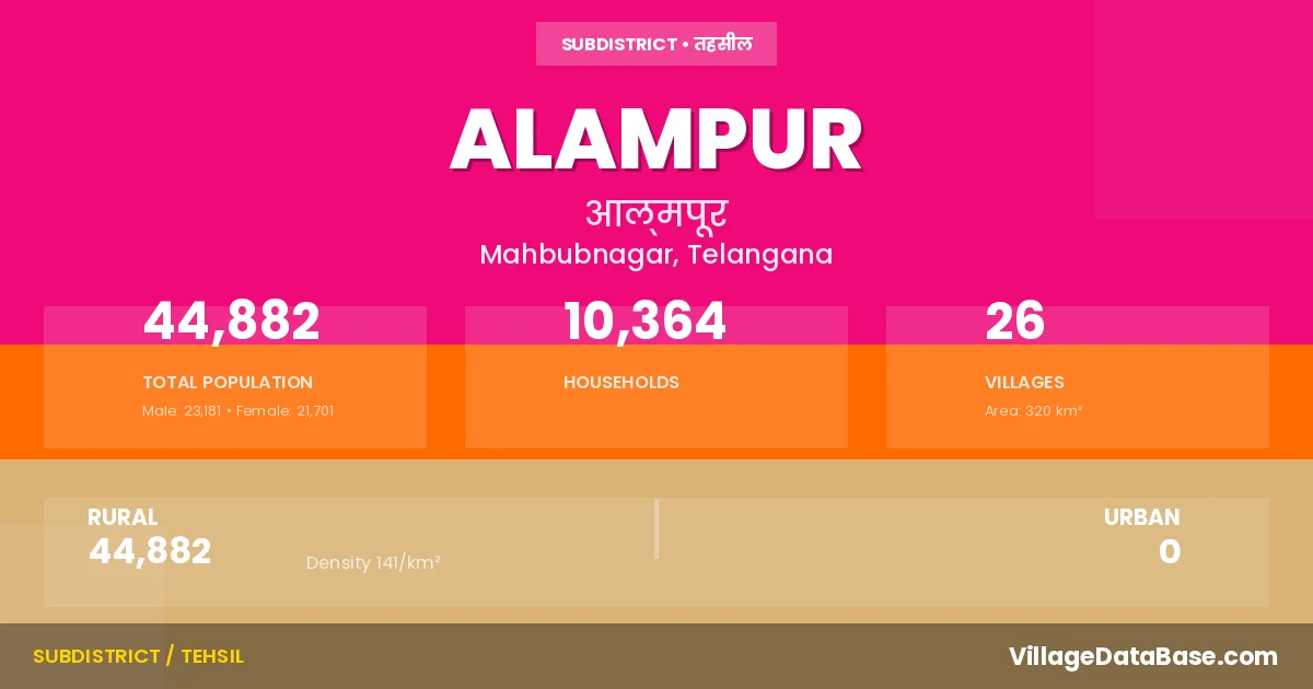 According to the 2011 census The total area of Alampur Mandal is 320 km², with a population of 44882 people. The population density is 141 inhabitants per square kilometre, and there are approximately 10364 houses in the sub district.