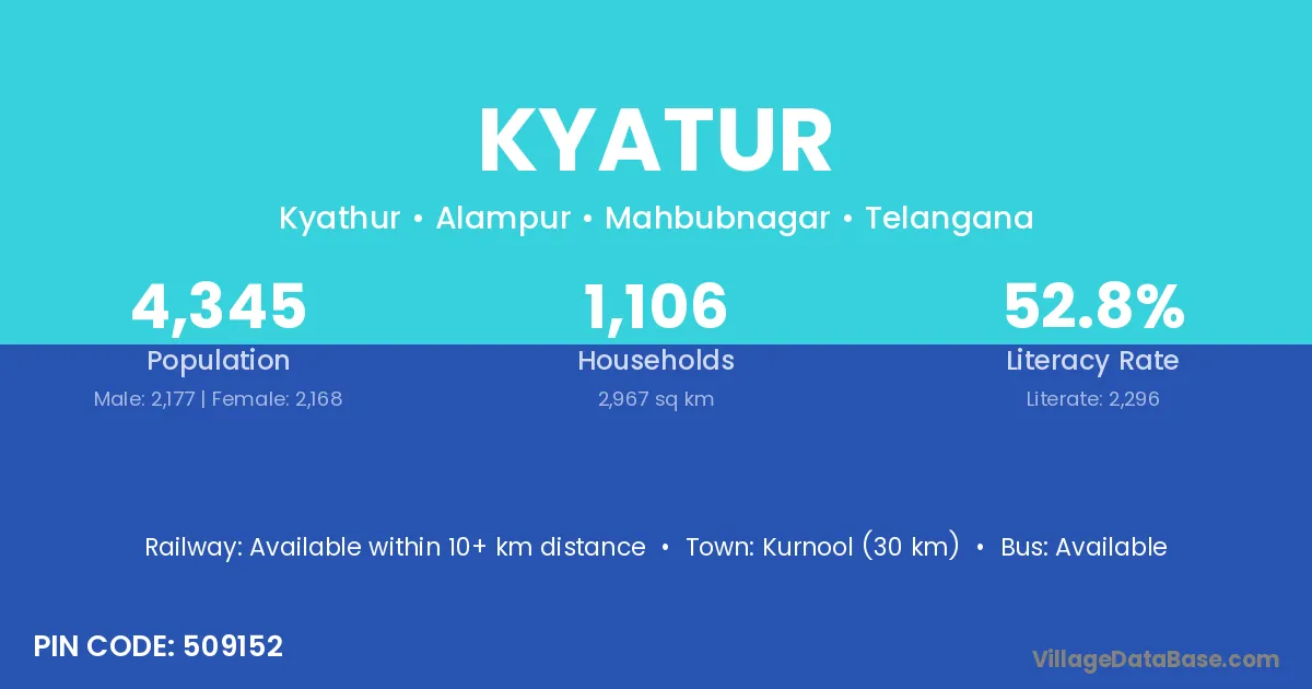 Kurnool (30 km) is the nearest town to Kyatur village for major economic activities and is located approximately 30 km away.