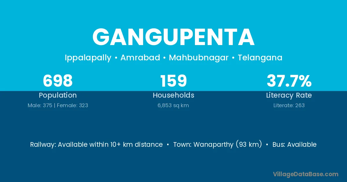 Wanaparthy (93 km) is the nearest town to Gangupenta village for major economic activities and is located approximately 93 km away.