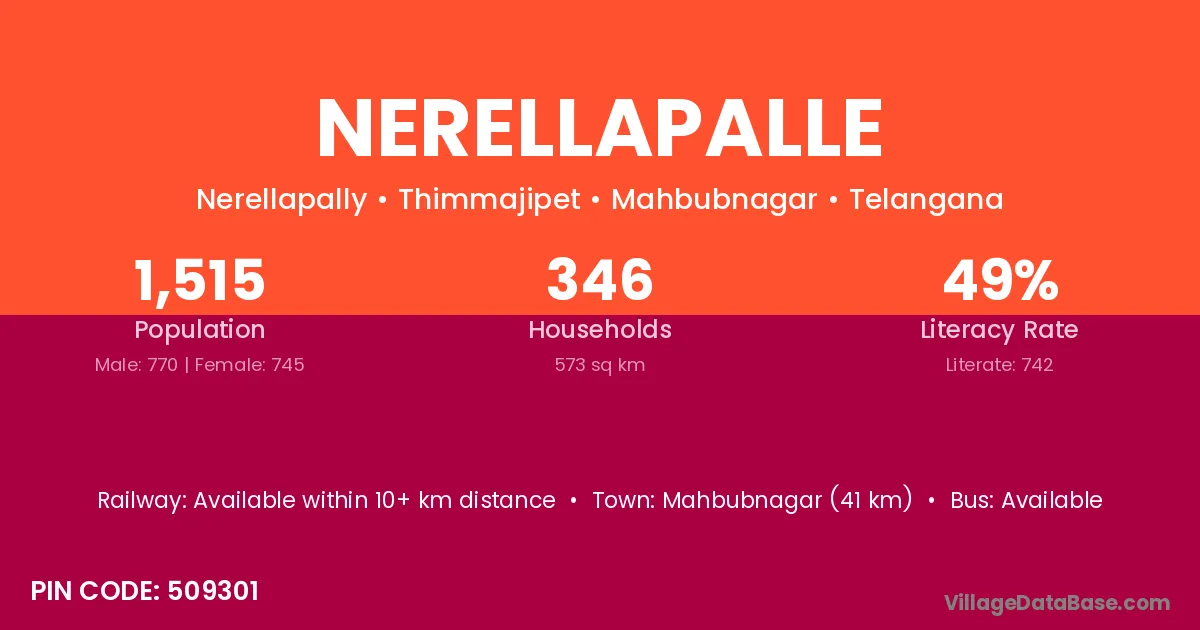 Mahbubnagar (40 km) is the nearest town to Nerellapalle village for major economic activities and is located approximately 40 km away.
