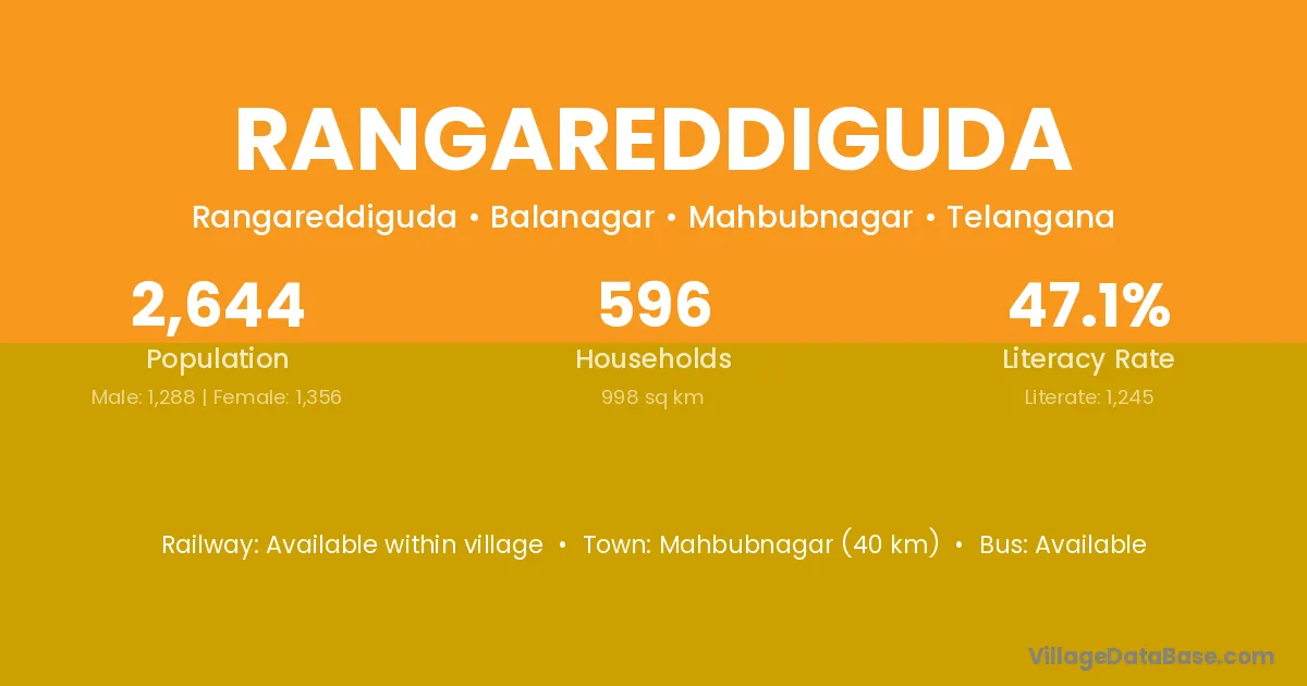 Mahbubnagar (40 km) is the nearest town to Rangareddiguda village for major economic activities and is located approximately 40 km away.