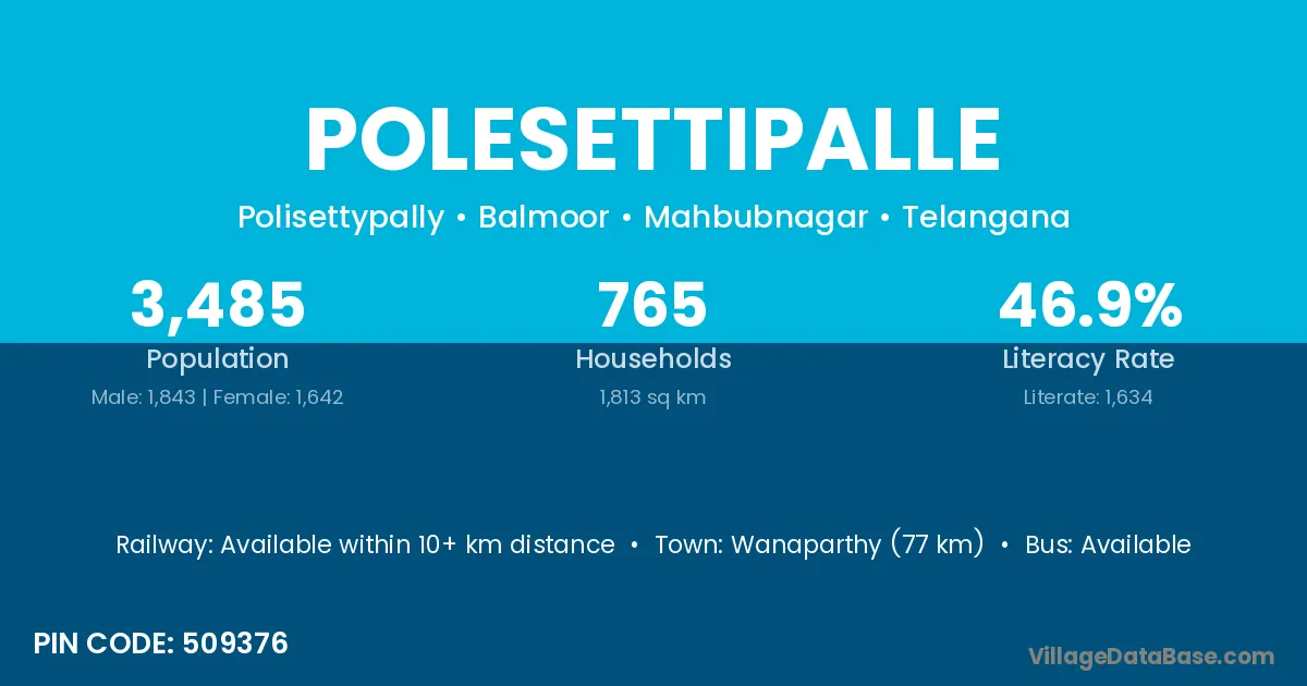Wanaparthy (77 km) is the nearest town to Polesettipalle village for major economic activities and is located approximately 77 km away.