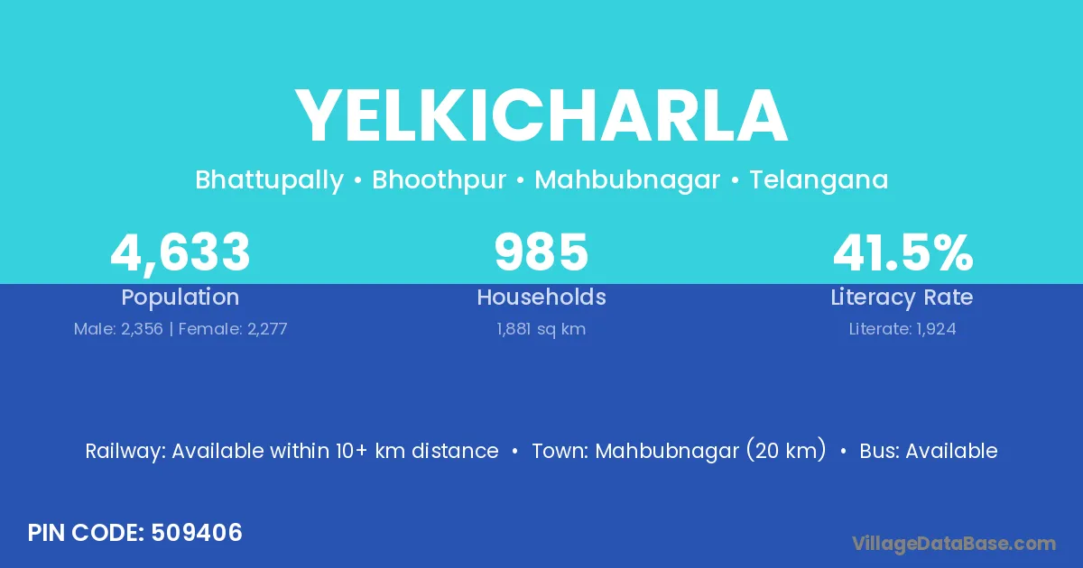 Mahbubnagar (20 km) is the nearest town to Yelkicharla village for major economic activities and is located approximately 20 km away.
