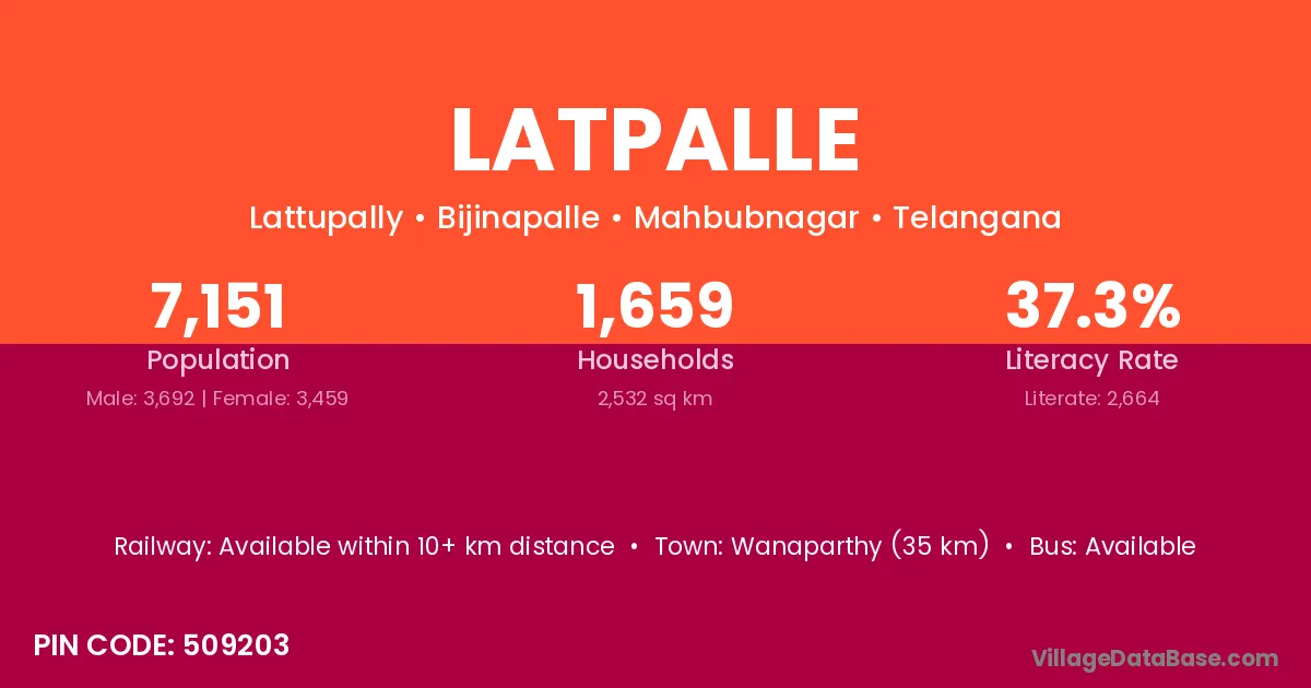 Wanaparthy (35 km) is the nearest town to Latpalle village for major economic activities and is located approximately 35 km away.