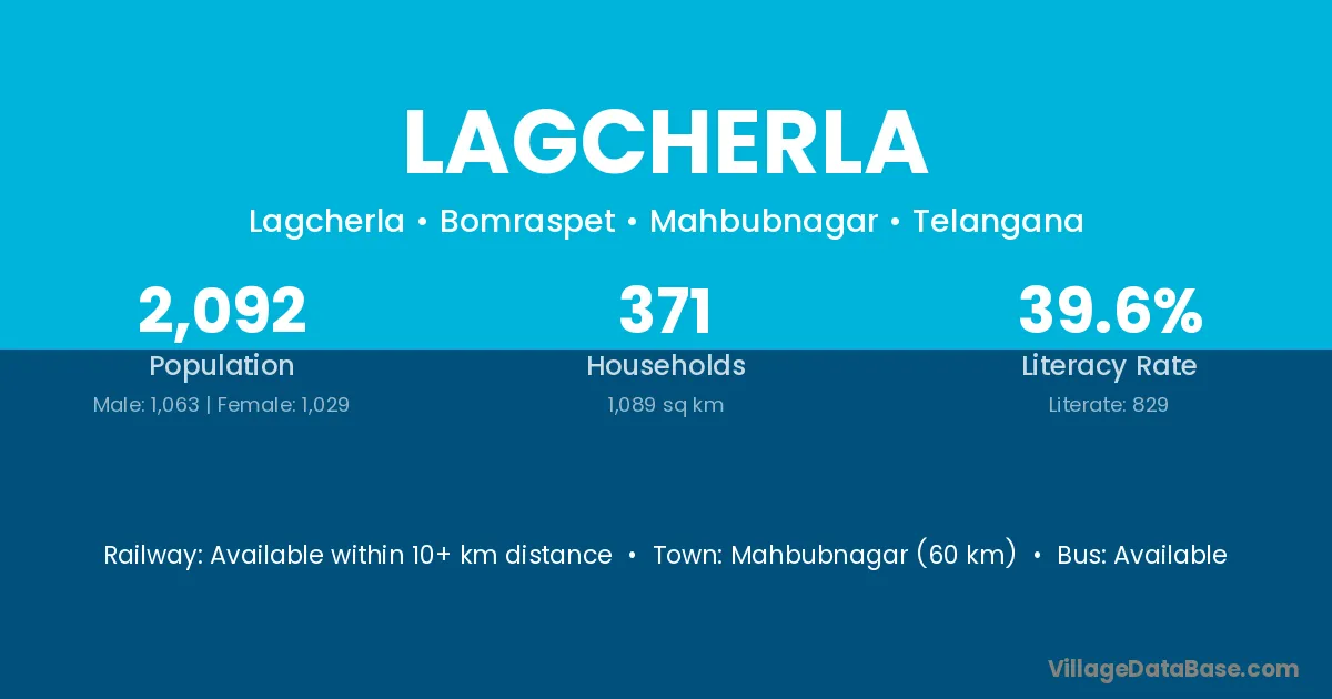 Mahbubnagar (60 km) is the nearest town to Lagcherla village for major economic activities and is located approximately 60 km away.