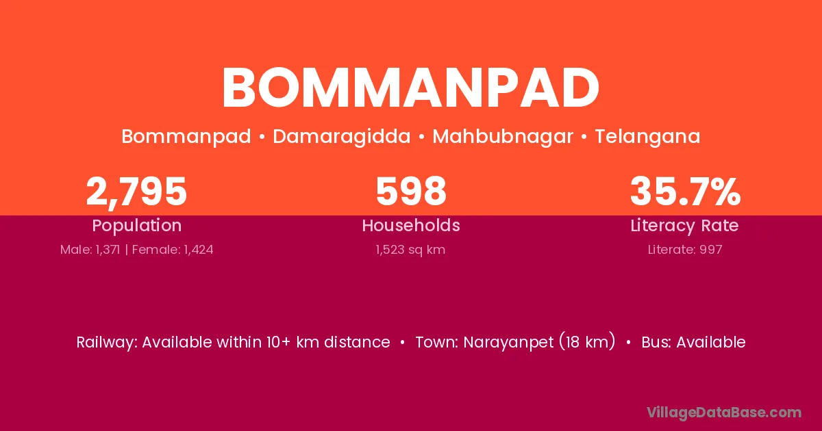 Narayanpet (18 km) is the nearest town to Bommanpad village for major economic activities and is located approximately 18 km away.