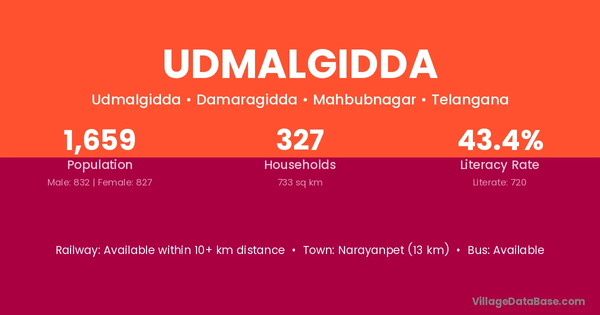 Narayanpet (13 km) is the nearest town to Udmalgidda village for major economic activities and is located approximately 13 km away.