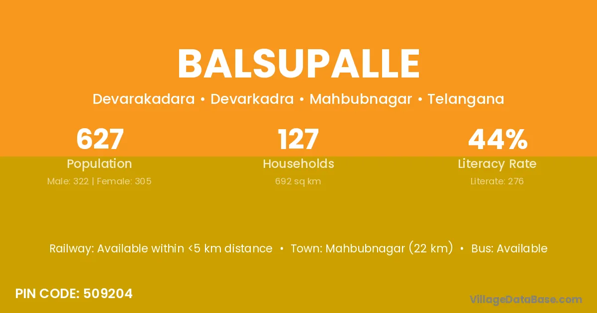 Mahbubnagar (22 km) is the nearest town to Balsupalle village for major economic activities and is located approximately 22 km away.