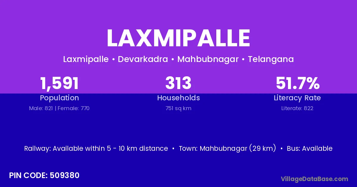 Mahbubnagar (29 km) is the nearest town to Laxmipalle village for major economic activities and is located approximately 29 km away.
