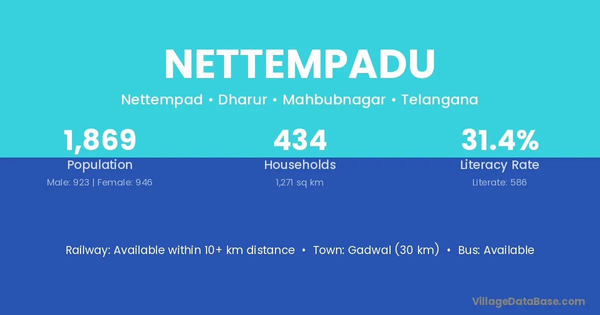 Gadwal (30 km) is the nearest town to Nettempadu village for major economic activities and is located approximately 30 km away.