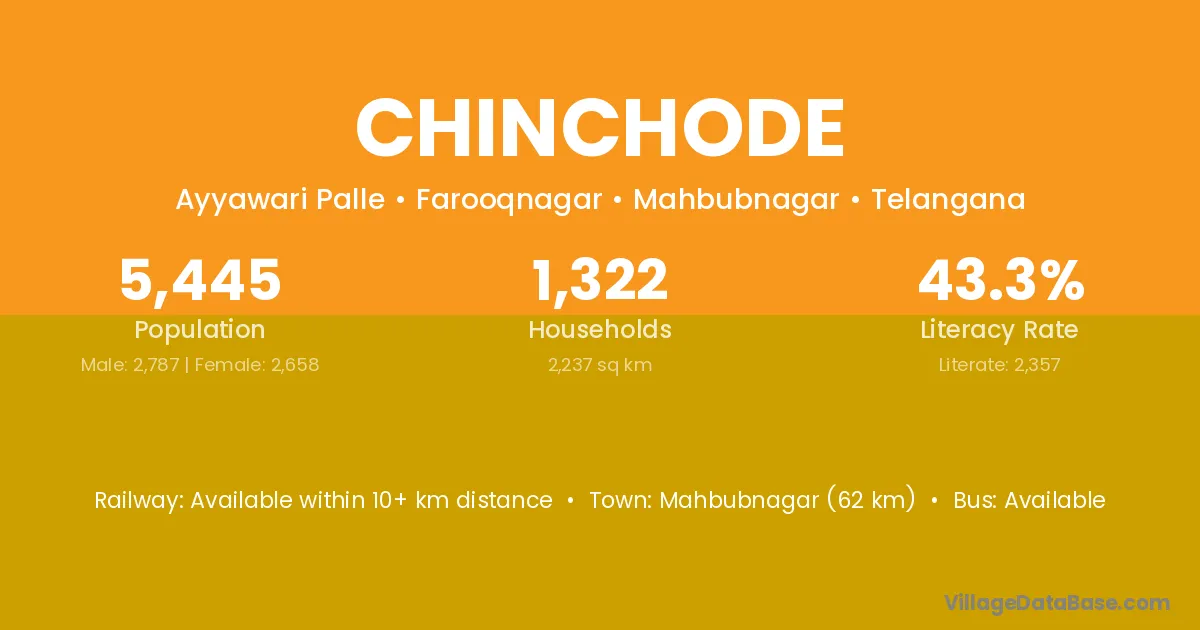 Mahbubnagar (62 km) is the nearest town to Chinchode village for major economic activities and is located approximately 62 km away.