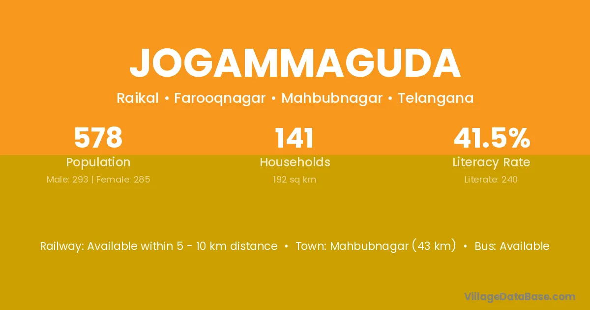 Jogammaguda village has a total population of 578 people, of which 293 are males and 285 are females.