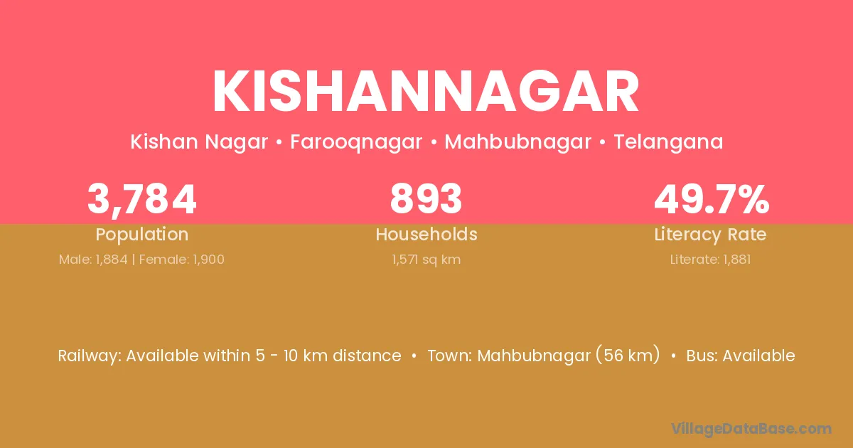 Mahbubnagar (56 km) is the nearest town to Kishannagar village for major economic activities and is located approximately 56 km away.