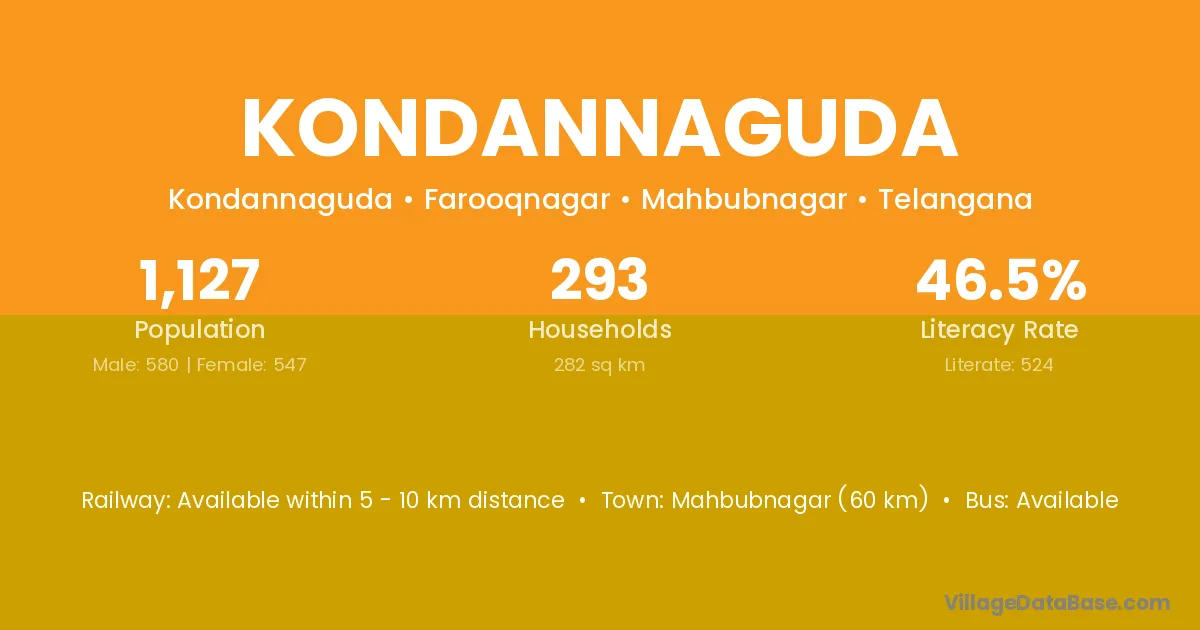 Mahbubnagar (60 km) is the nearest town to Kondannaguda village for major economic activities and is located approximately 60 km away.